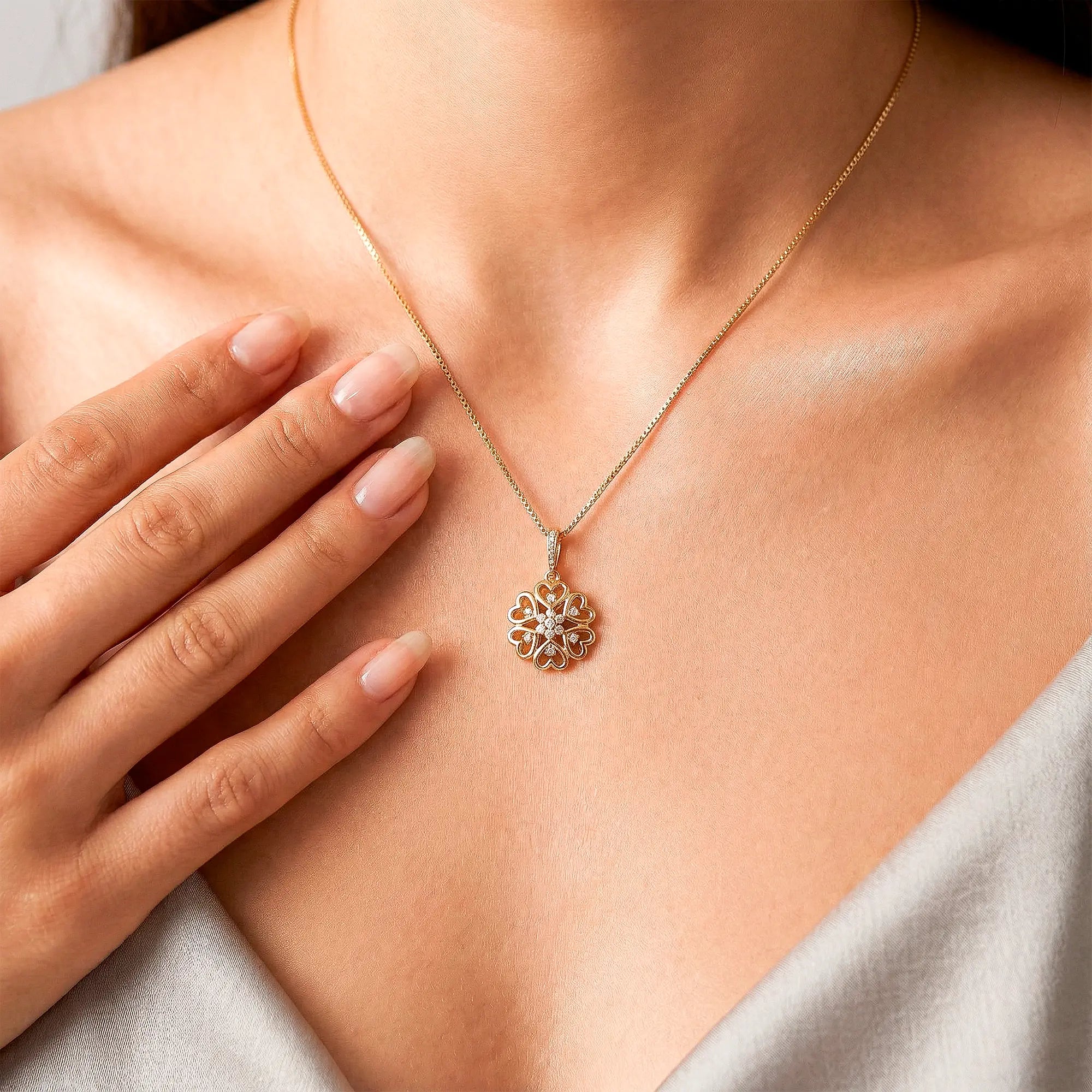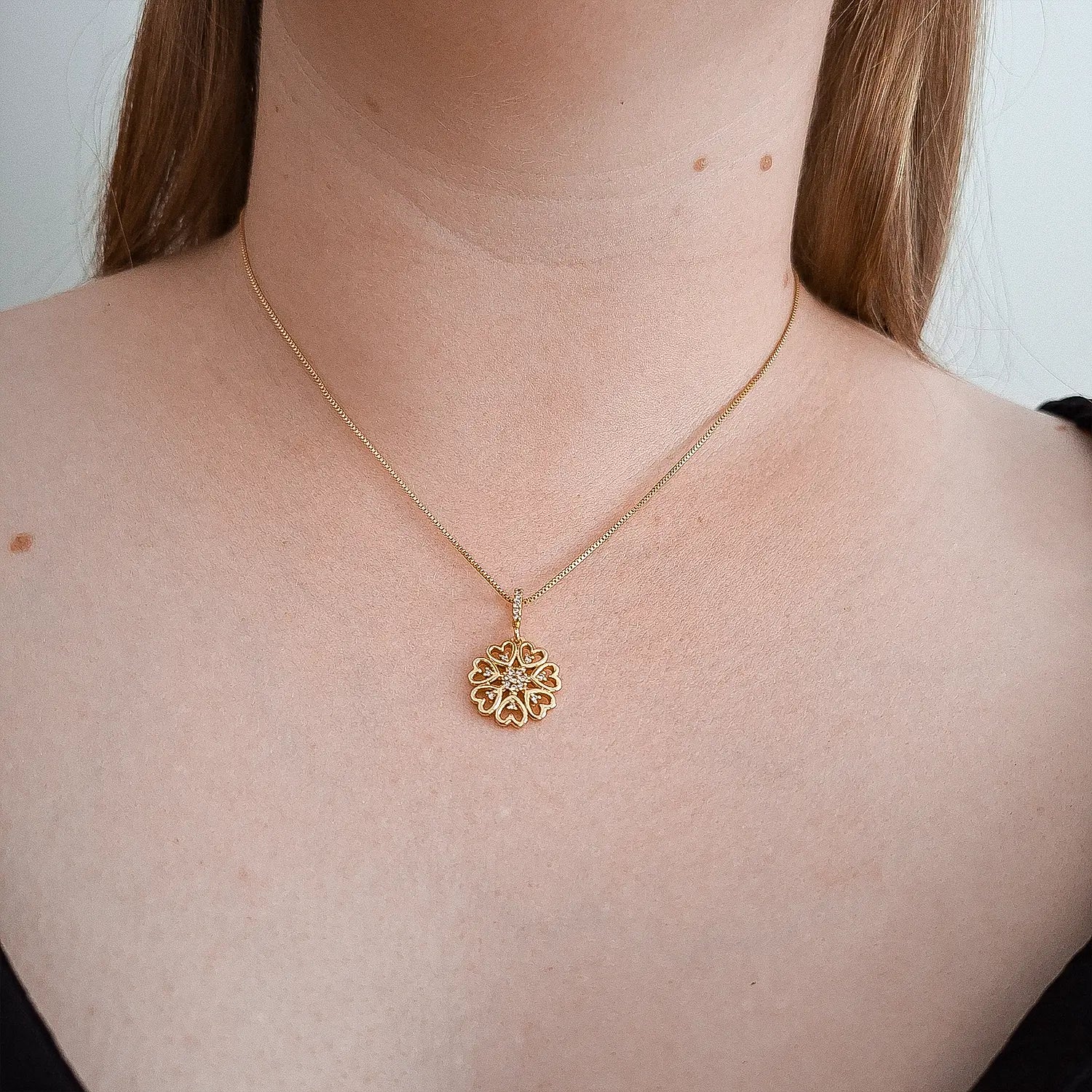 O Colar Lumine é uma joia encantadora, criada para transmitir brilho, leveza e romantismo. Seu pingente em formato floral, composto por delicados corações vazados e detalhes cravejados ao centro, simboliza amor, harmonia e elegância, tornando a peça única e cheia de significado. 💖✨