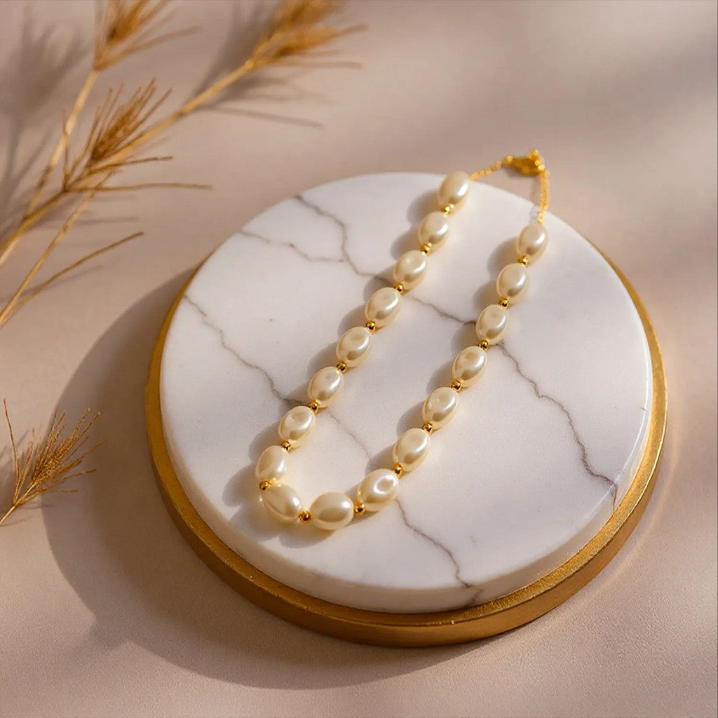 Colar Pérolas Barroca – Elegância Atemporal O colar de pérolas é a escolha ideal para quem busca sofisticação e delicadeza em uma única peça. Com design clássico e acabamento refinado, este colar combina pérolas em formato orgânico intercaladas por esferas metálicas douradas, trazendo brilho e charme na medida certa.