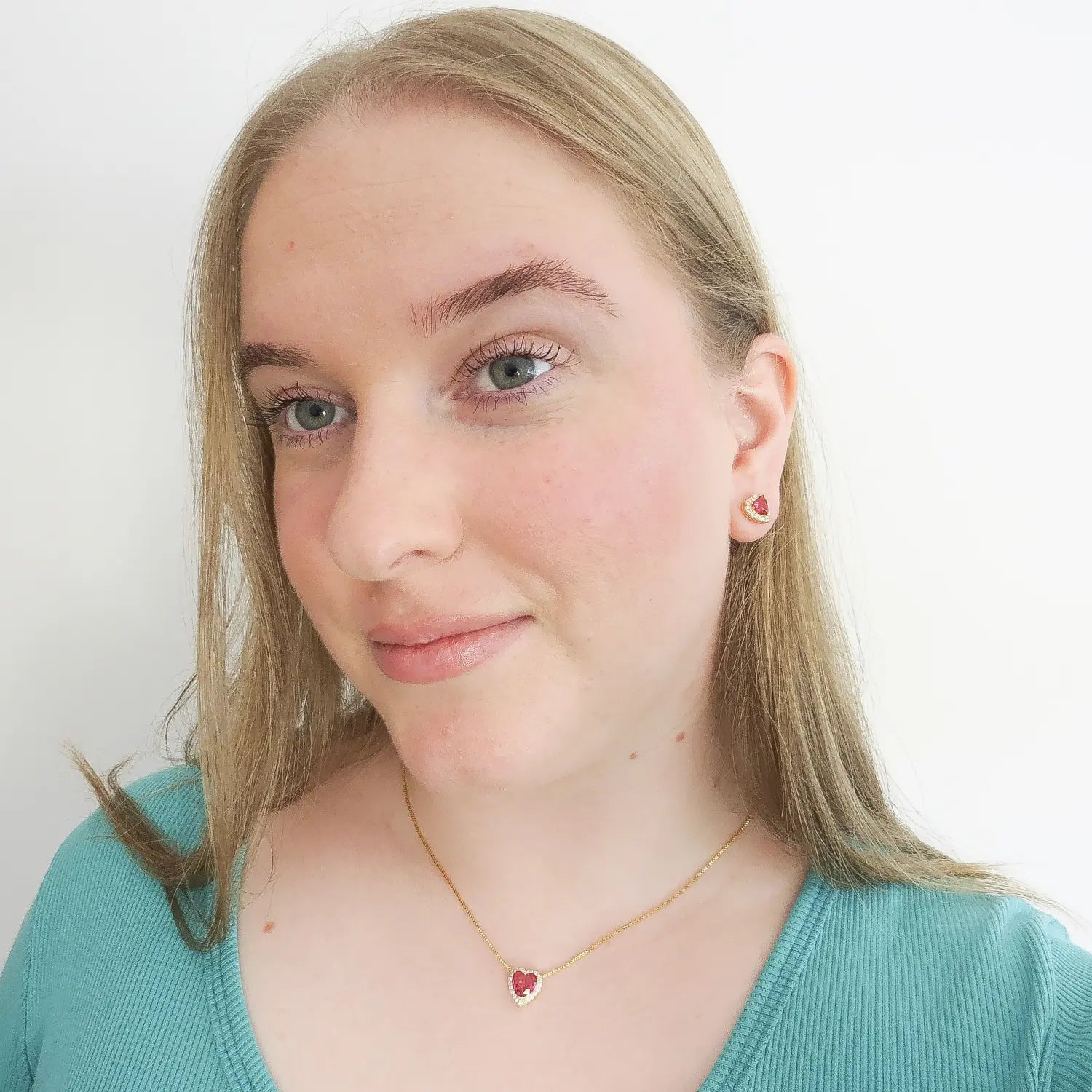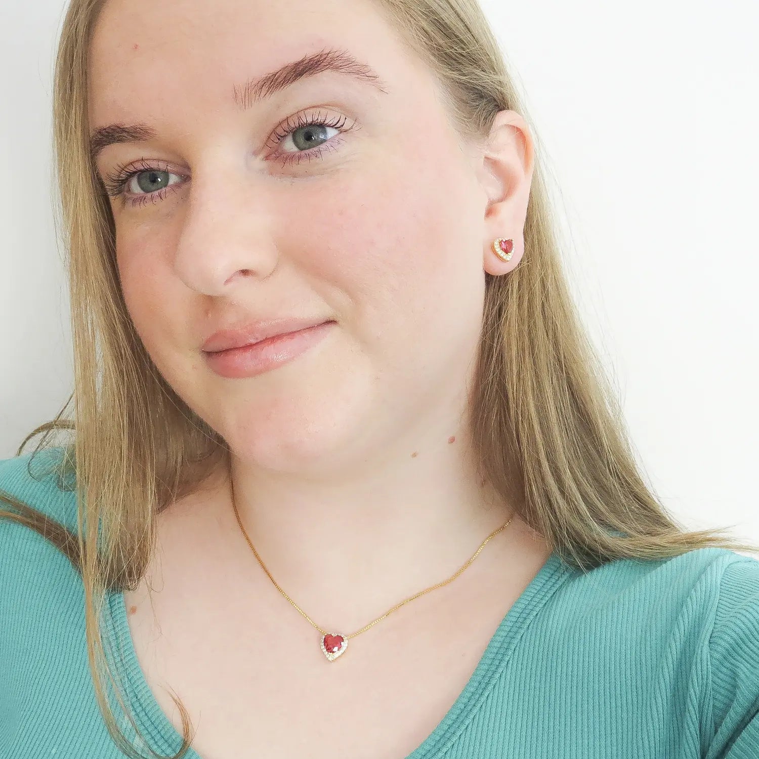 O conjunto com pedra coração na cor rubi é uma verdadeira declaração de amor e elegância. Composto por colar e brincos banhados a ouro 18k, cada peça traz um cristal em formato de coração, em tom rubi intenso, envolvido por delicadas zircônias cravejadas que intensificam o brilho e o charme do conjunto.