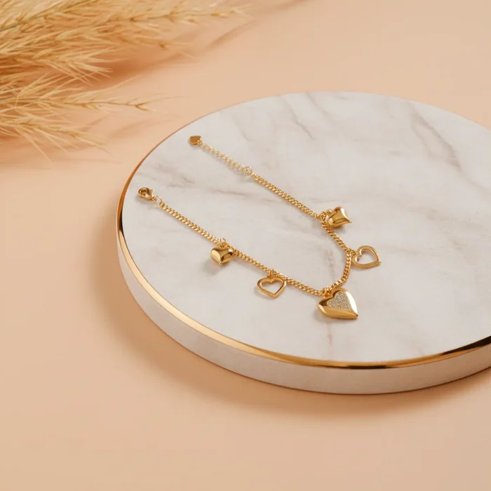 A Pulseira Corações Dourada é a escolha perfeita para quem ama acessórios delicados, modernos e cheios de significado. Com uma corrente fina e elegante, ela traz vários pingentes de coração em diferentes estilos — vazados, lisos e um coração central com detalhe texturizado — criando um visual romântico e sofisticado.